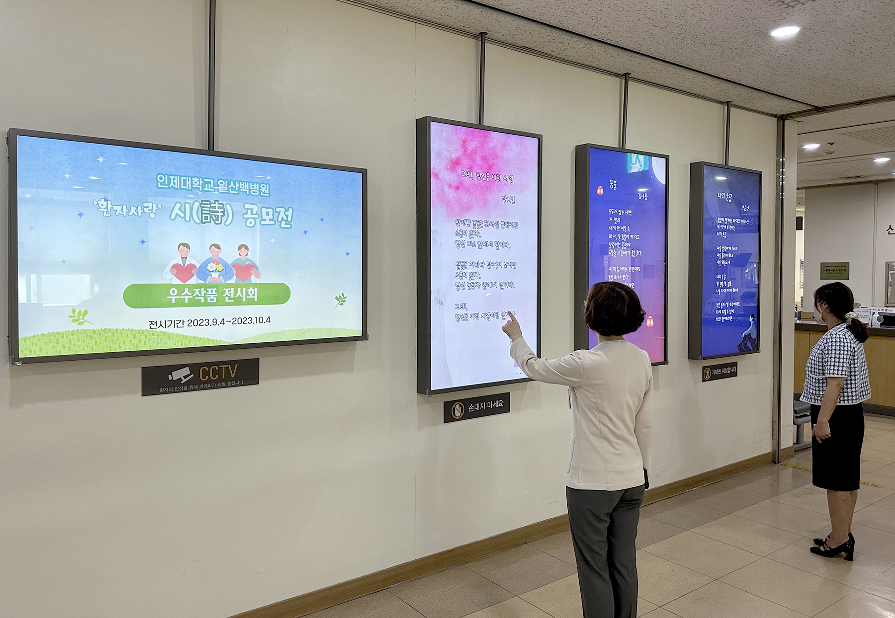 일산백병원, '환자사랑 시(詩) 전시회‘ 개최 - 2·3층 외래 DID 전시, '희망·위로·응원' 메시지 전달 인제대학교 일산백병원(원장 이성순)이 ’환자사랑 시(詩) 전시회‘를 개최했다. 이번 전시는 '환자사랑 시(詩) 공모전'에서 우수상을 받은 10편을 정리해 2층과 3층 외래 디지털 모니터에 전시했다. 전시 작품은 ▲문턱(김일주) ▲너의 손길(양은영) ▲등불(김아름) ▲숨 쉬는 배(김완수) ▲바람(이태영) ▲그래, 당신은 이런 사람(박지인) ▲새싹(이수미) ▲당신은 나에게(임현) ▲위대한 인생(김해숙) ▲희망(김현숙) 등 총 10편이다. 이현일 홍보실장은 "저자들은 은유적 표현을 적절히 사용해 환자들에게 희망과 위로, 응원 메시지를 간결한 언어로 잘 전하고 있다"며 "작품을 감상하며 잠시나마 몸과 ..