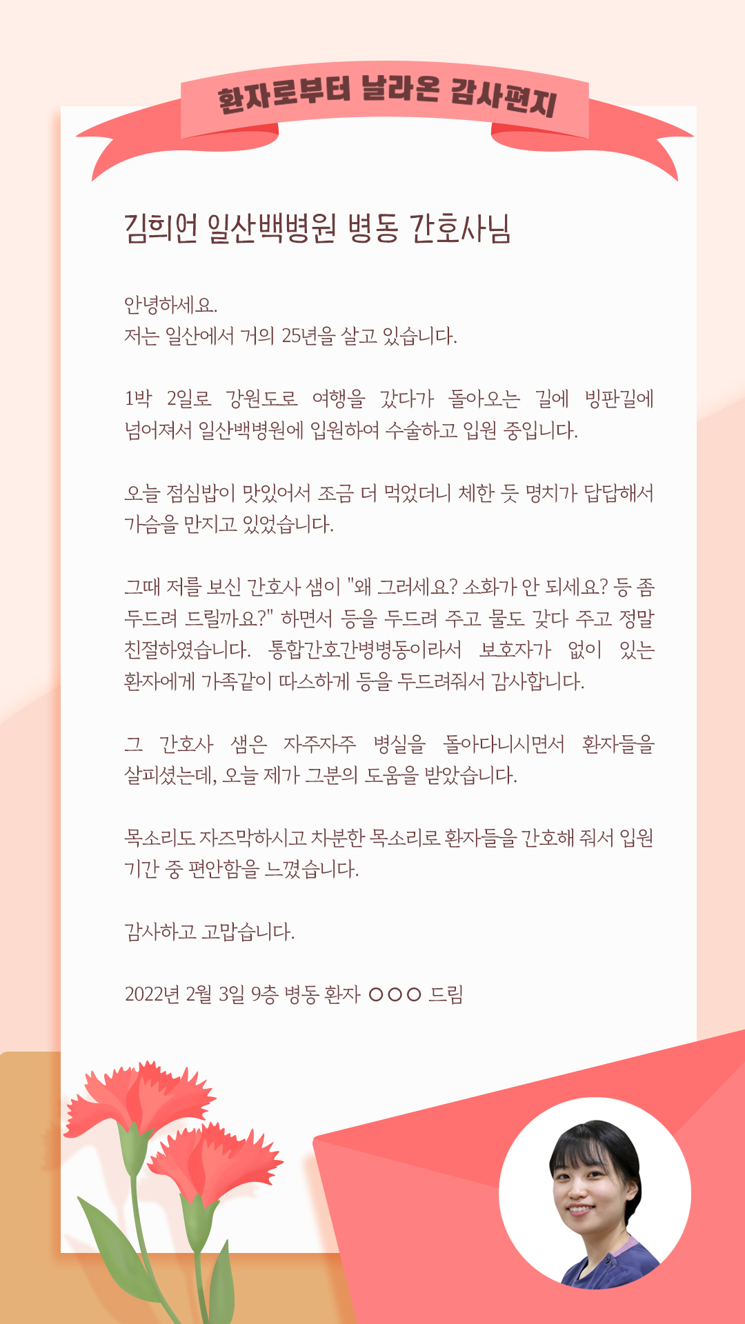 [환자로부터 날아온 감사편지] 김희언 간호사 선생님, 고맙습니다.