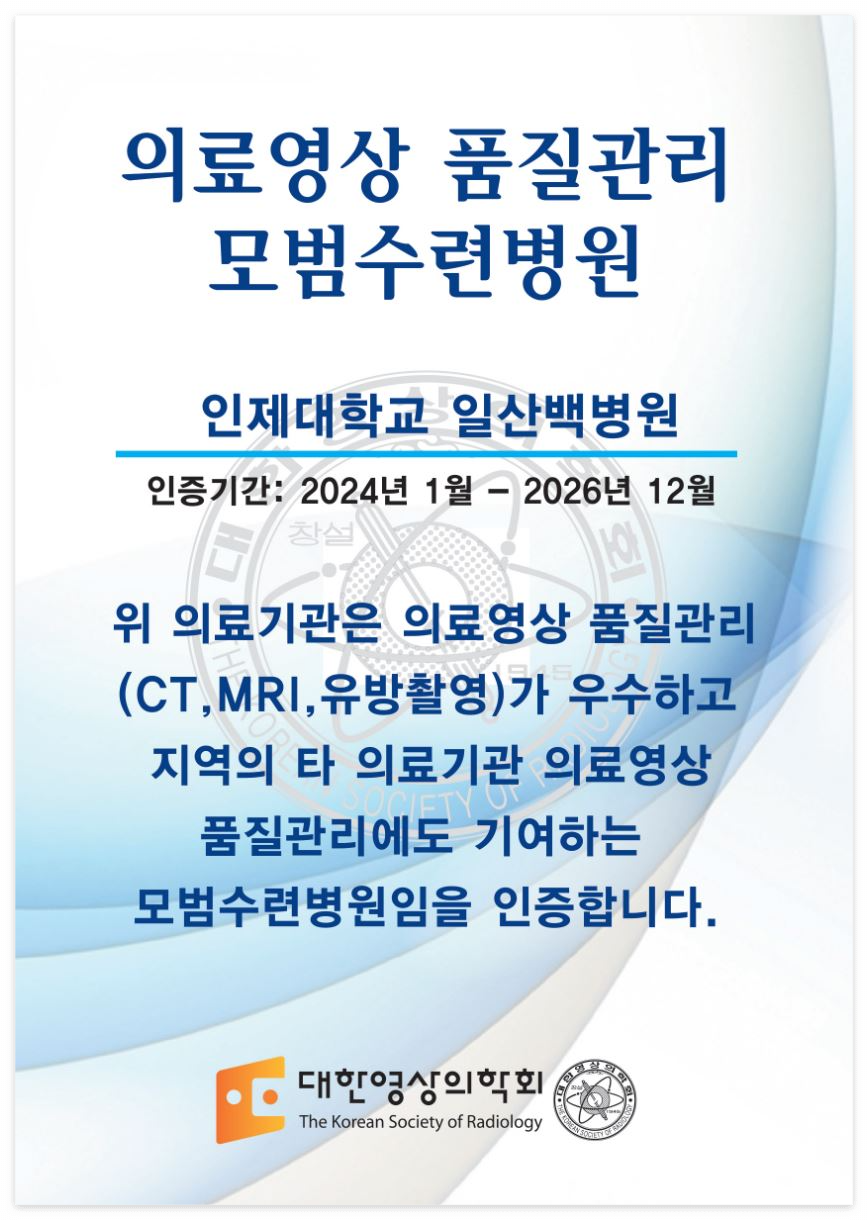 일산백병원, 대한영상의학회 '의료영상 품질관리 모범수련병원' 인증